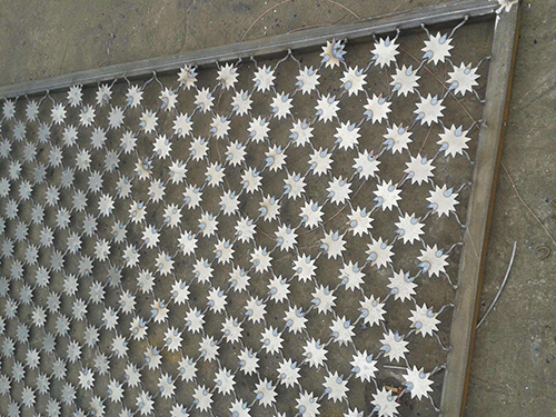 2、網片為菱形網孔,網格尺寸:120mm*110mm(高*寬),網絲直徑8mm,采用S195線材高壓焊接,每一個焊點附焊梅花刺一個。
