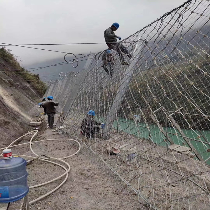 被動邊坡防護網是由鋼絲繩網、環形網、(需攔截小塊落石時附加一層鐵絲格柵)、固定系統(錨桿、拉錨繩、基座和支撐繩)減壓環和鋼柱四個主要部分構成。鋼柱和鋼絲繩網連接組合構成一個整體,對所防護的區域形成面防護,從而阻止崩塌巖石土體的下墜,起到邊坡防護作用。