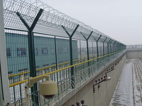 監獄鋼網墻的安裝結構:V型支架立拄,加強型焊接片網,安全防盜連接件和熱鍍鋅刀片刺籠組成。客戶要詳細說明這些組件的材質、規格,例如監獄鋼網墻的刀片刺網是采購不銹鋼304材質刀片刺網還是鍍鋅材質刀片刺網。V網是否折彎或者增加加強筋,有的客戶為了造價低廉也選擇不用V網,而是在Y形柱上焊接刺繩勾,直接把刀片刺繩掛在立柱上,用4根3mm左右鍍鋅絲加固。