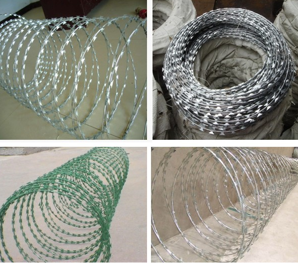 圍墻安全防護刀刺滾網特 點:圍墻安全防護刀刺滾網又名刮刀型刺絲,是一種近年發展起來的防護、隔離能力較強的新型防護網產品。它采用鋼板沖壓成型包附于鋼絲(筋絲)之上,由銳利尖角鍍鋅鋼板或不銹鋼薄板做刀片,高張力鋼絲做芯線組合而成的。鋒利的刀型刺由雙線扣裝后成蛇腹狀,既美觀又讓人不寒而栗。起到了很好的阻嚇作用。    用 途:世界各國已將刀片刺網廣泛用于軍事重地、監獄、政府機關、銀行;生活小區圍墻、私人住宅、別墅的圍墻、門窗、高速公路、鐵路護欄以及邊境線等防護保安。