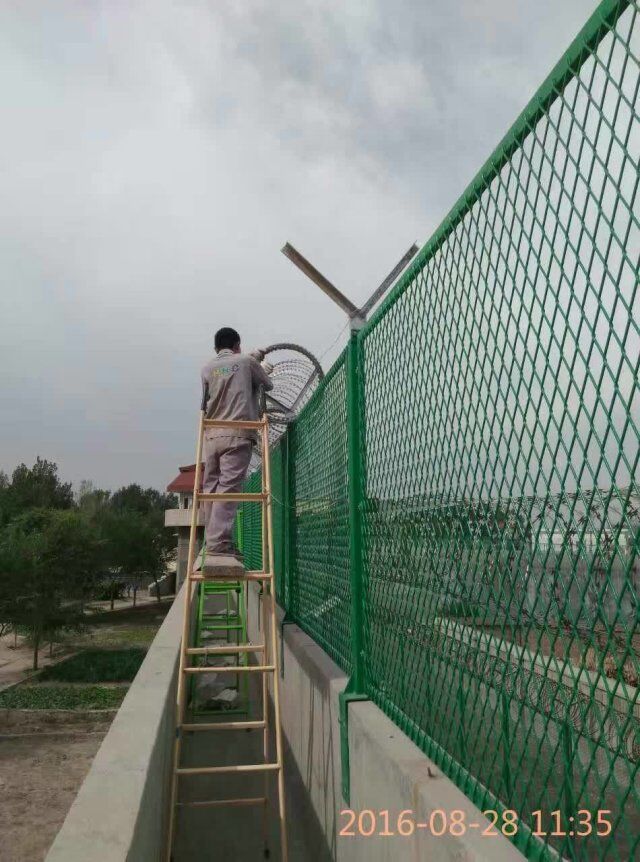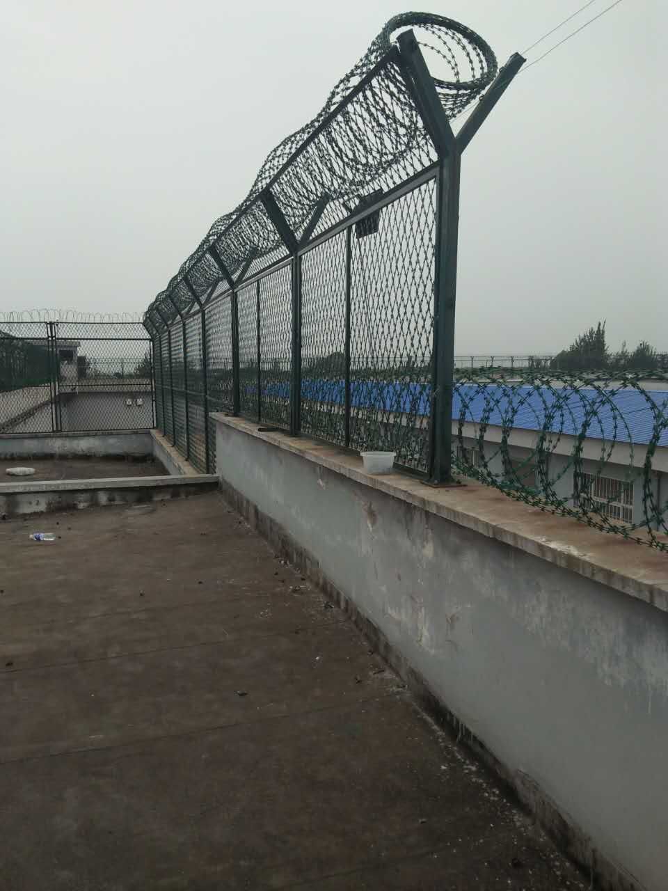 慕源公司可按客戶技術要求、實施方案生產制作本產。本產品整體設計高大、美觀、實用,網墻的設計具剪切、防攀爬功能,能夠十分有效的防止罪犯的潛逃。看守所巡邏道鋼網墻V型架頂端安裝刀片刺網,直徑采用50cm-60cm刀片刺網主要是由熱鍍鋅鋼板或不銹鋼薄板沖壓而成的,它擁有尖銳的刀片,高張力鍍鋅鋼絲或者不銹鋼絲做芯線組合而成的產品。